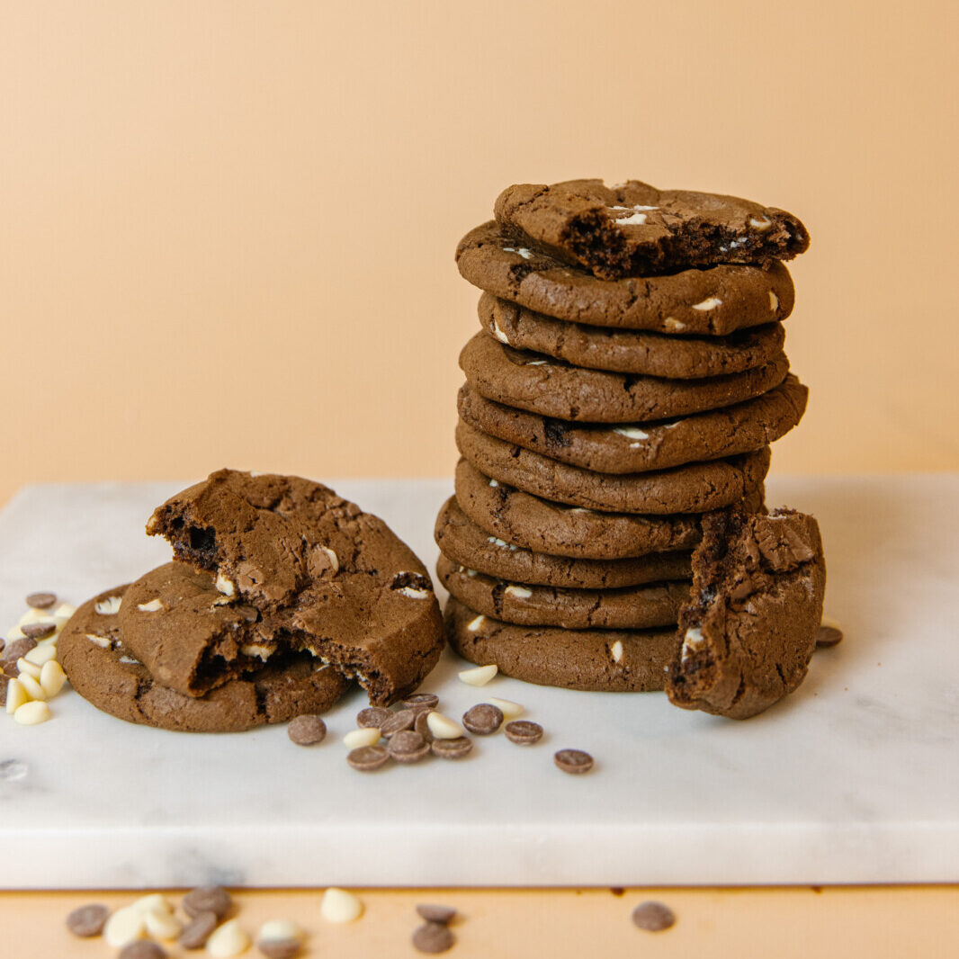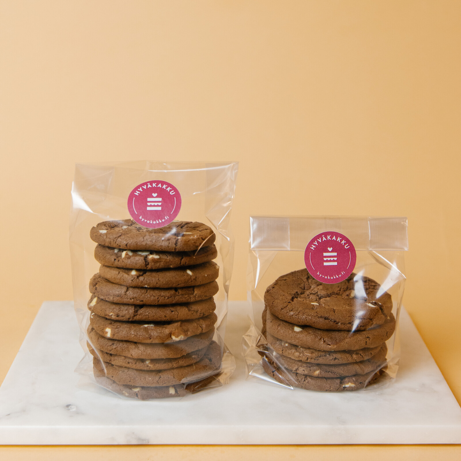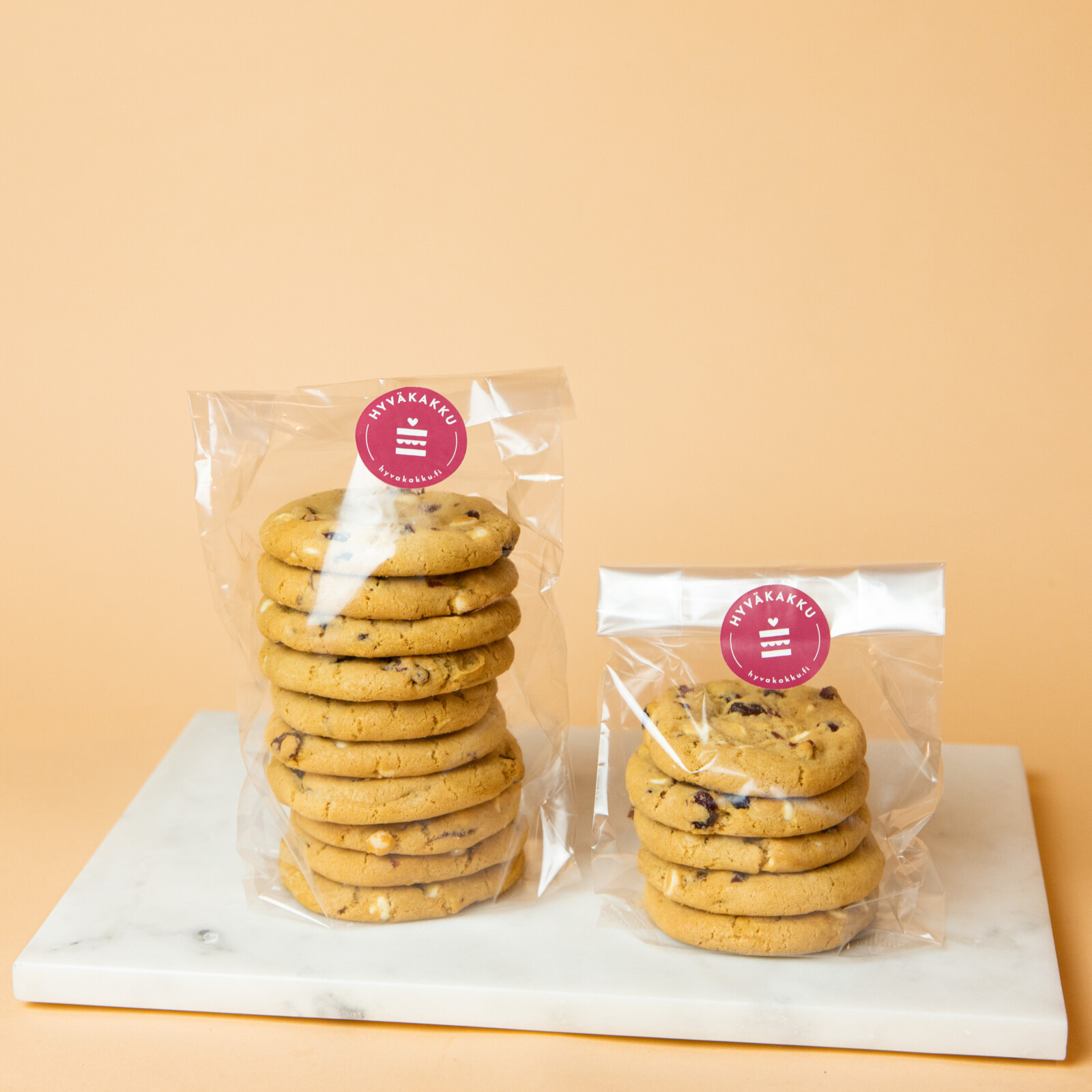 Herkulliset isot cookiet kahdessa eri maussa. Vaalea valkosuklaa-karpalo ja tumma tuplasuklaa. Klassisia, täydellisiä makuyhdistelmiä molemmat.