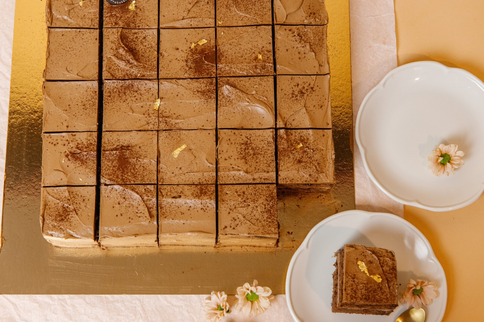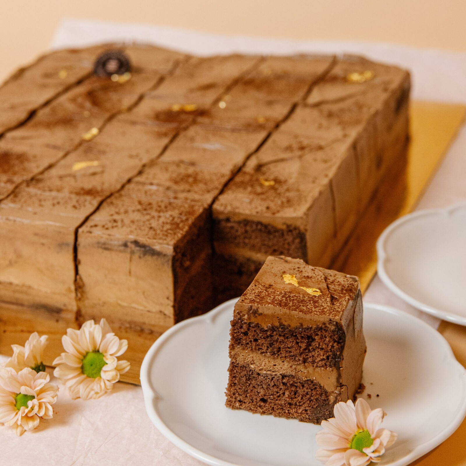 Kaakaopohjan välistä löytyy suussasulava suklaamousse. Kakun pinta on kuorrutettu täyteläisellä suklaakreemillä . Viimeistelty ripauksella lehtikultaa, joka tuo leivoksiin ylellistä juhlan tuntua. Kakku on leikattu valmiiksi 30 palaan. Täydellinen valinta suklaan ystävälle. Elegantti ja helposti tarjottava herkku tilaisuuteen kuin tilaisuuteen.