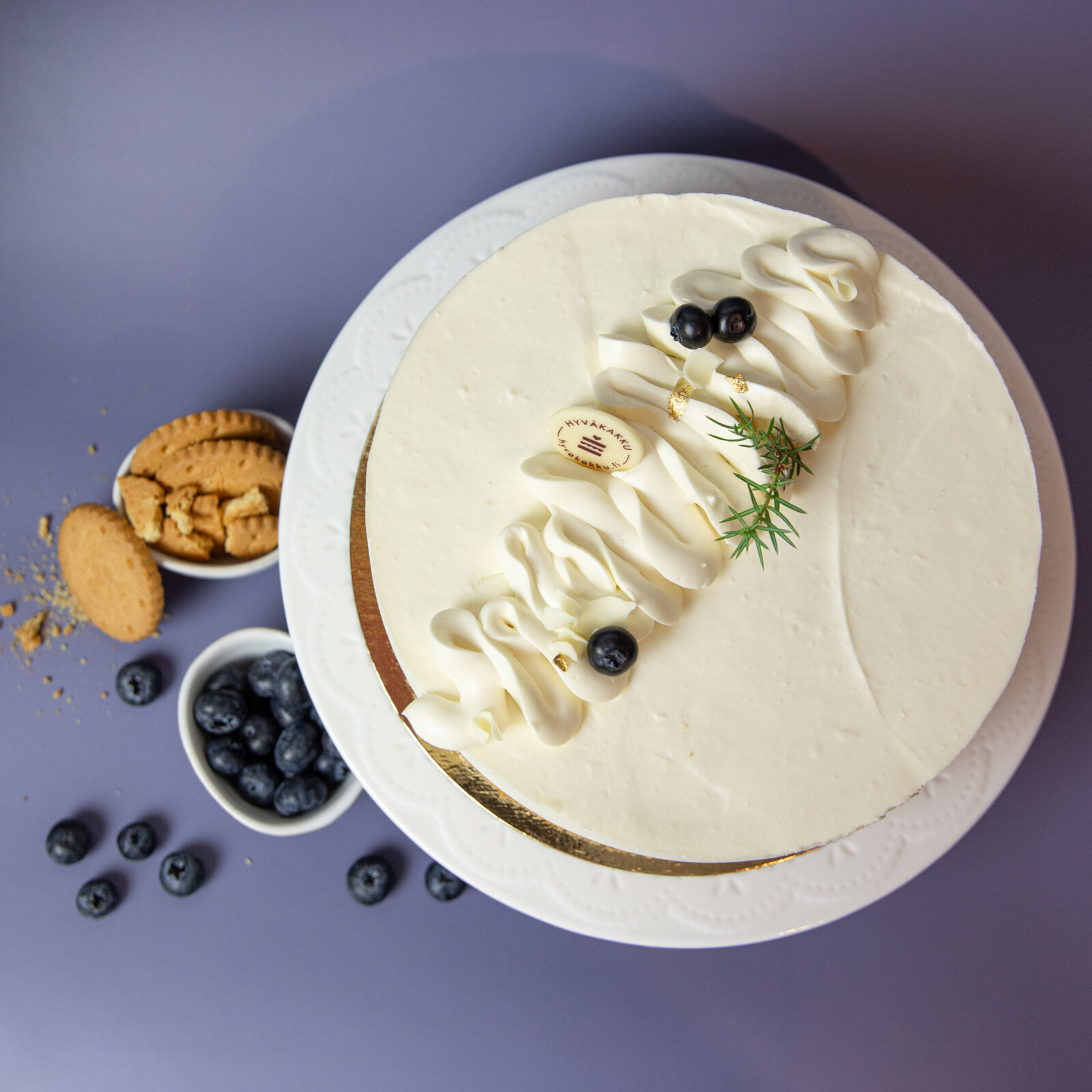 Lumen valkoisen kakun koristelussa on pala suomalaista metsää, sinisiä mustikoita ja aitoa lehtikultaa Suomen Lapista.