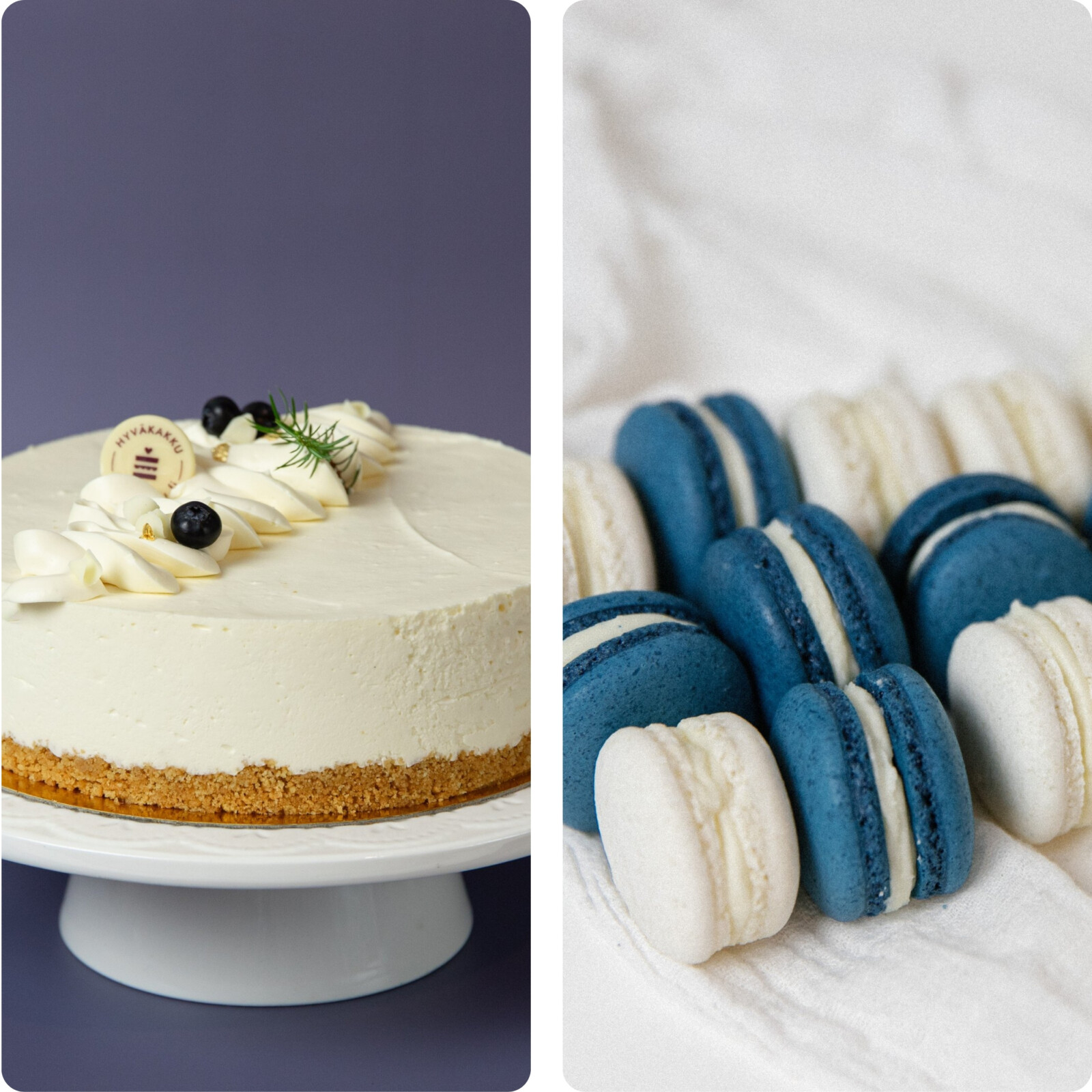 Itsenäisyyspäivän herkulliset lakka-valkosuklaan makuiset Suomi-macaronsit (9kpl) ja mustikka-valkosuklaamoussekakku (12hlö)